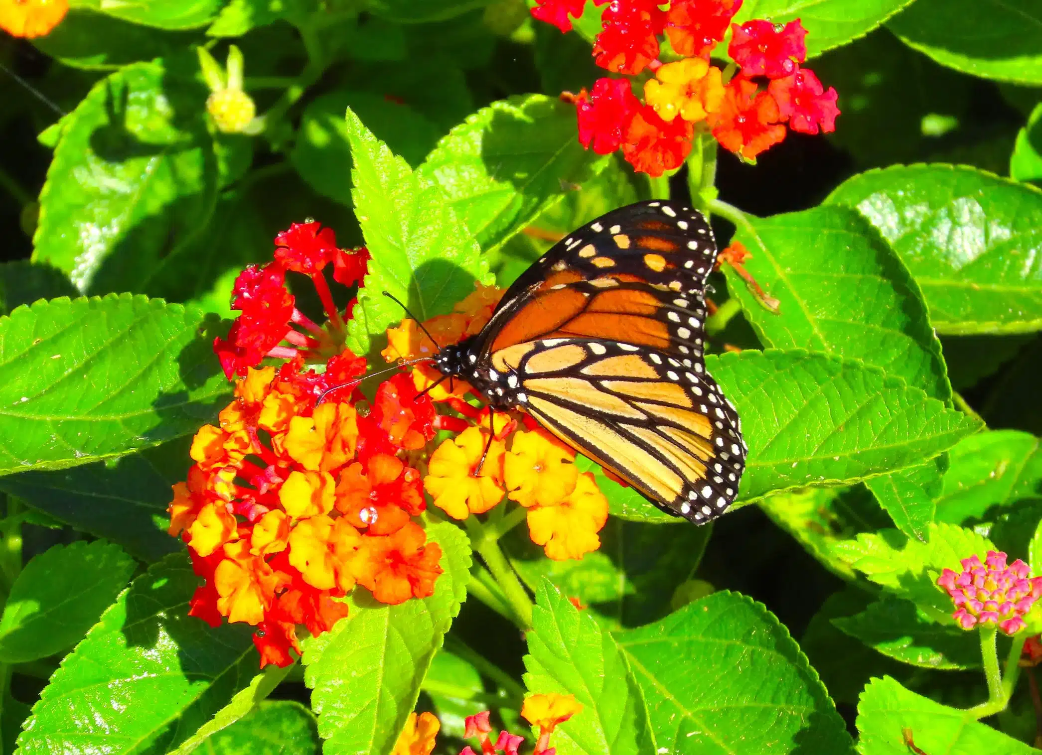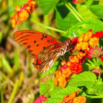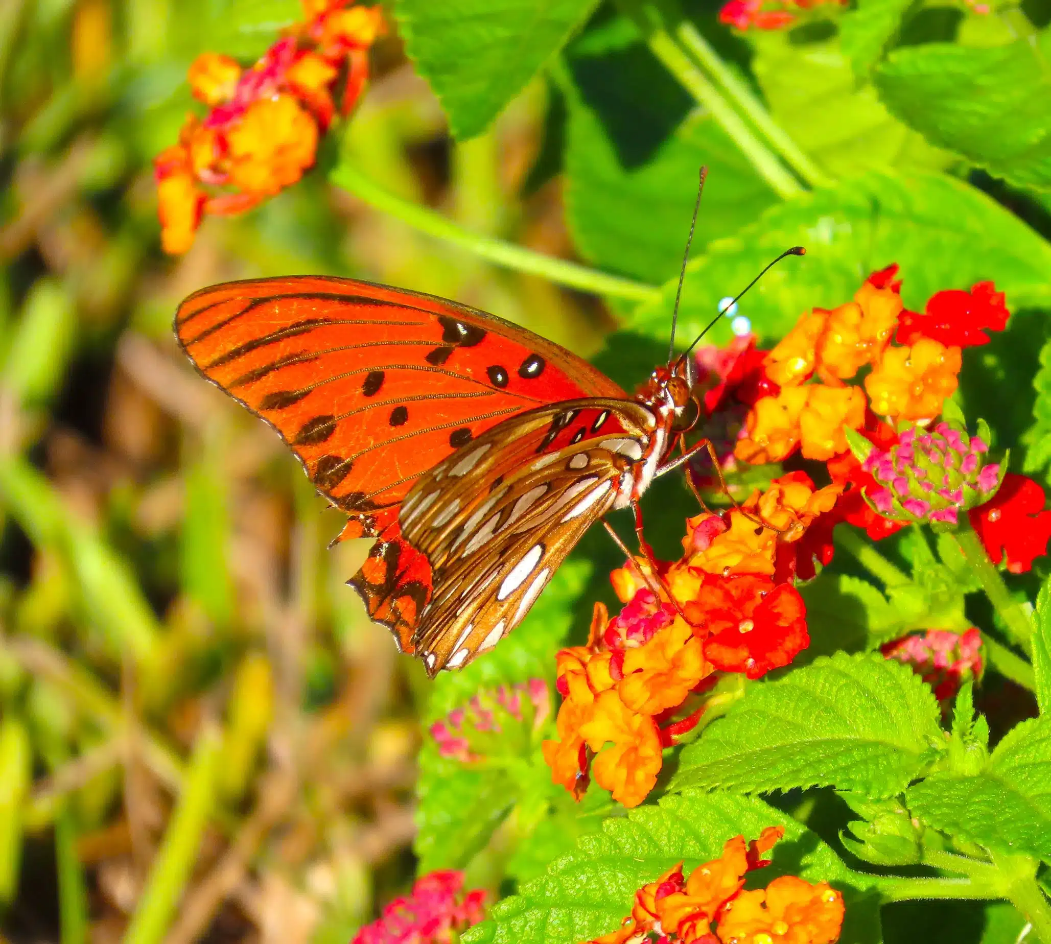 One solution to the problem of scarcity of nectar producing flowers in Fall/Winter is to plant non-native species such as lantana whose flowers are very attractive to nectar feeding butterflies. Some will discard this approach because they refuse to plant non-natives which might be invasive. But I dead head (remove seed heads) from these plants and find them indispensable for maintaining butterflies in a winter garden. Thus you will see here three photos of a monarch, a long tailed skipper and a gulf fritillary feeding on nectar of lantana.