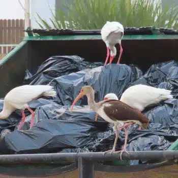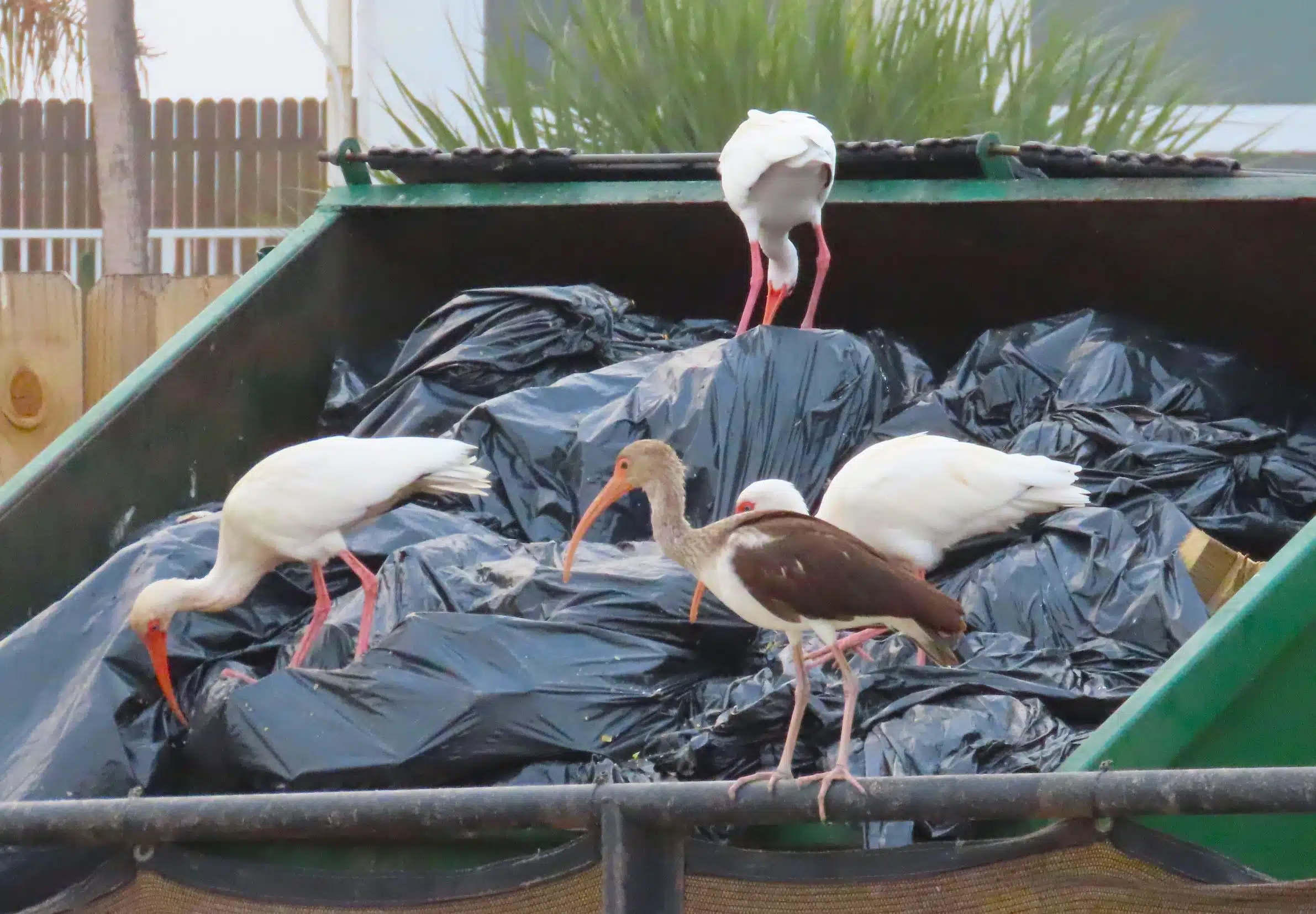 There are also many other birds on the beach. Black bellied plovers are distinctive although they lack the dark belly when not breeding. Snowy egrets are quite beautiful and show off their bright yellow feet which are used to flush fish from their hiding places. This snowy also has yellow on the rear of its legs indicating it is a juvenile. The snowy and the great egret are white their entire lives and this color may be related to their hunting habit of catching fish from above the water- white is harder to see against a bright sky background than a dark coloration. Both of these species have adjusted well to human invasion of their habitats. But perhaps less well than the white ibis shown here feeding in a dumpster across from the beach. As disgusting as this is, it represents a practical change in behavior of some birds in response to human modification of their habitats.
