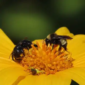- A large bumblebee shares a Mexican sunflower with a black carpenter bee