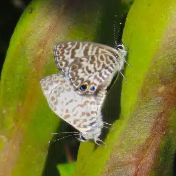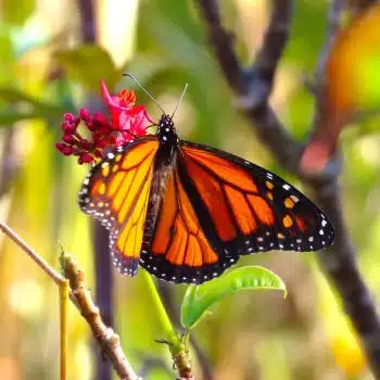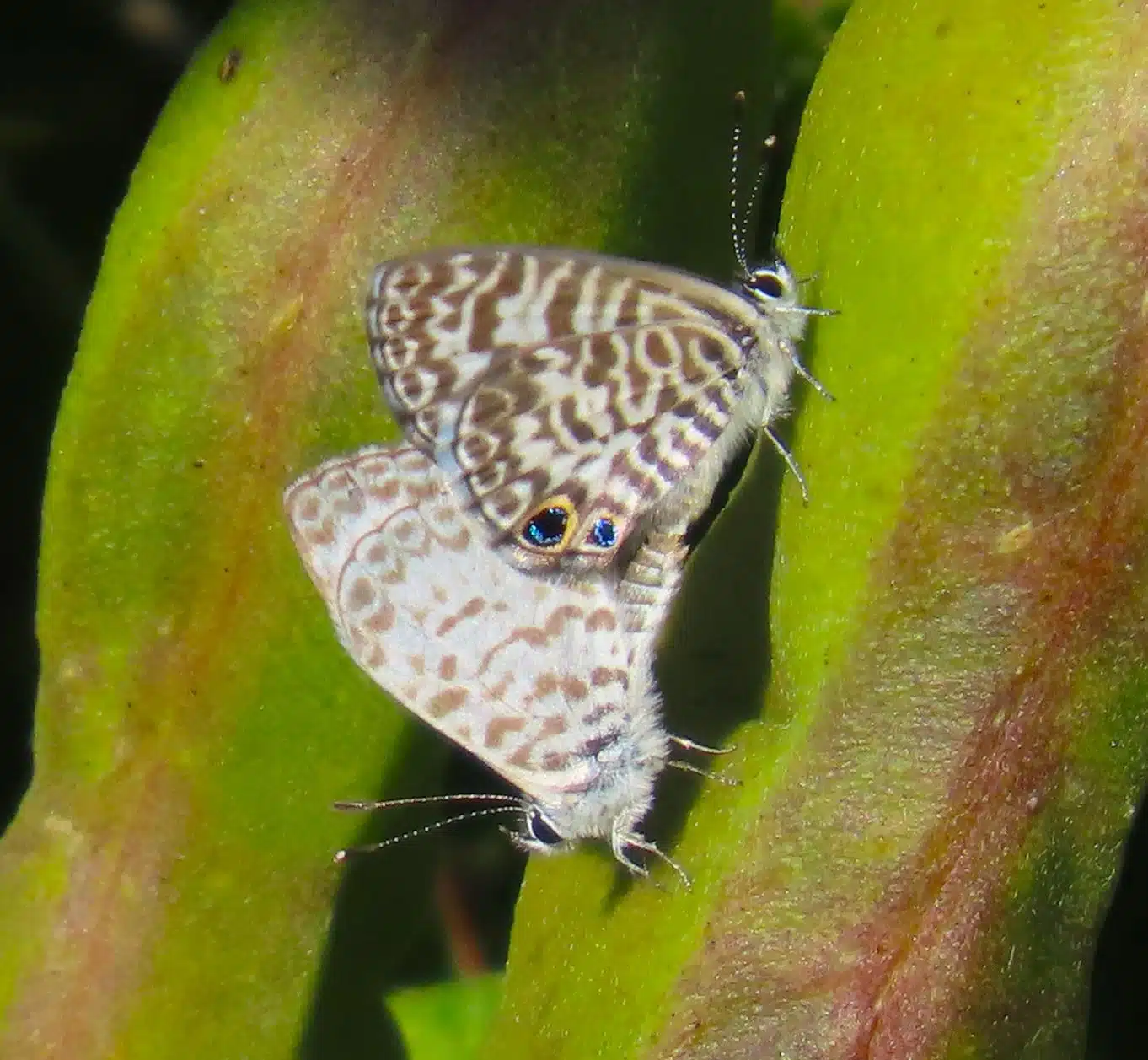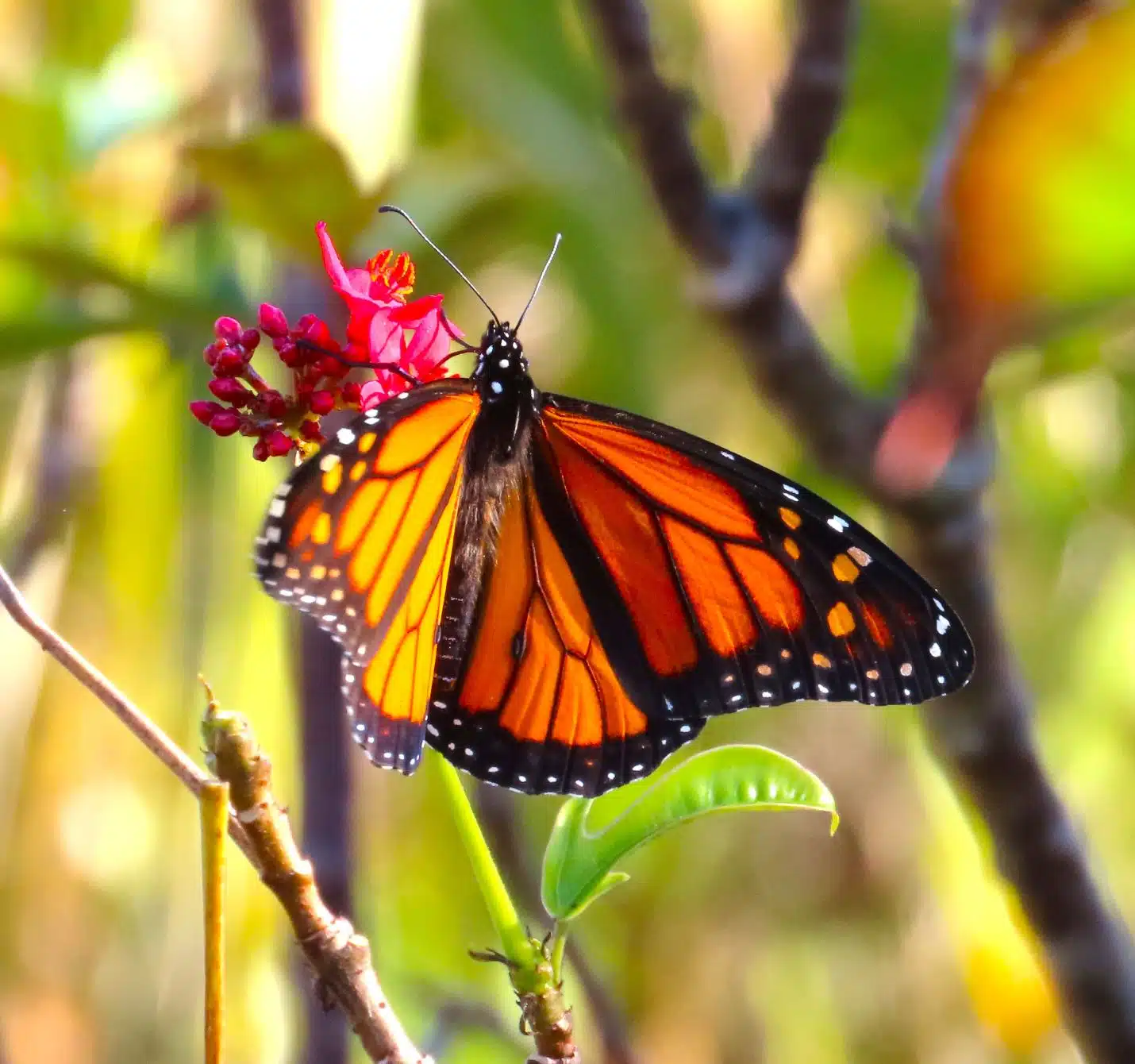 Winter is a difficult time for butterflies because of the low temperatures and greatly reduced number of flowers with nectar. I do have many Cassius blues attracted to lots of tiny heliotrope flowers and this pair is in the process of mating. The “false head” spots on the rear of the wings is quite striking. I have several cassias blooming as well as Panama rose which have attracted two types of large spectacular sulphur butterflies, cloudless and orange barred. They fly very fast and rarely alight for long in an apparent attempt to avoid predation by birds. The cassias/sennas are the food plant for the caterpillars but I rarely see larvae due most likely to predaceous paper wasps. I have quite a few monarchs in my island yard which are attracted to jatropha, two non-native milkweeds, and various other flowers. I almost never see the related queen butterflies which are a milkweed specialist that is found inland only a few miles.