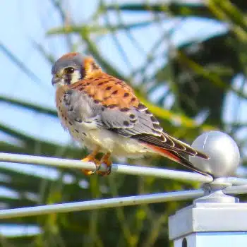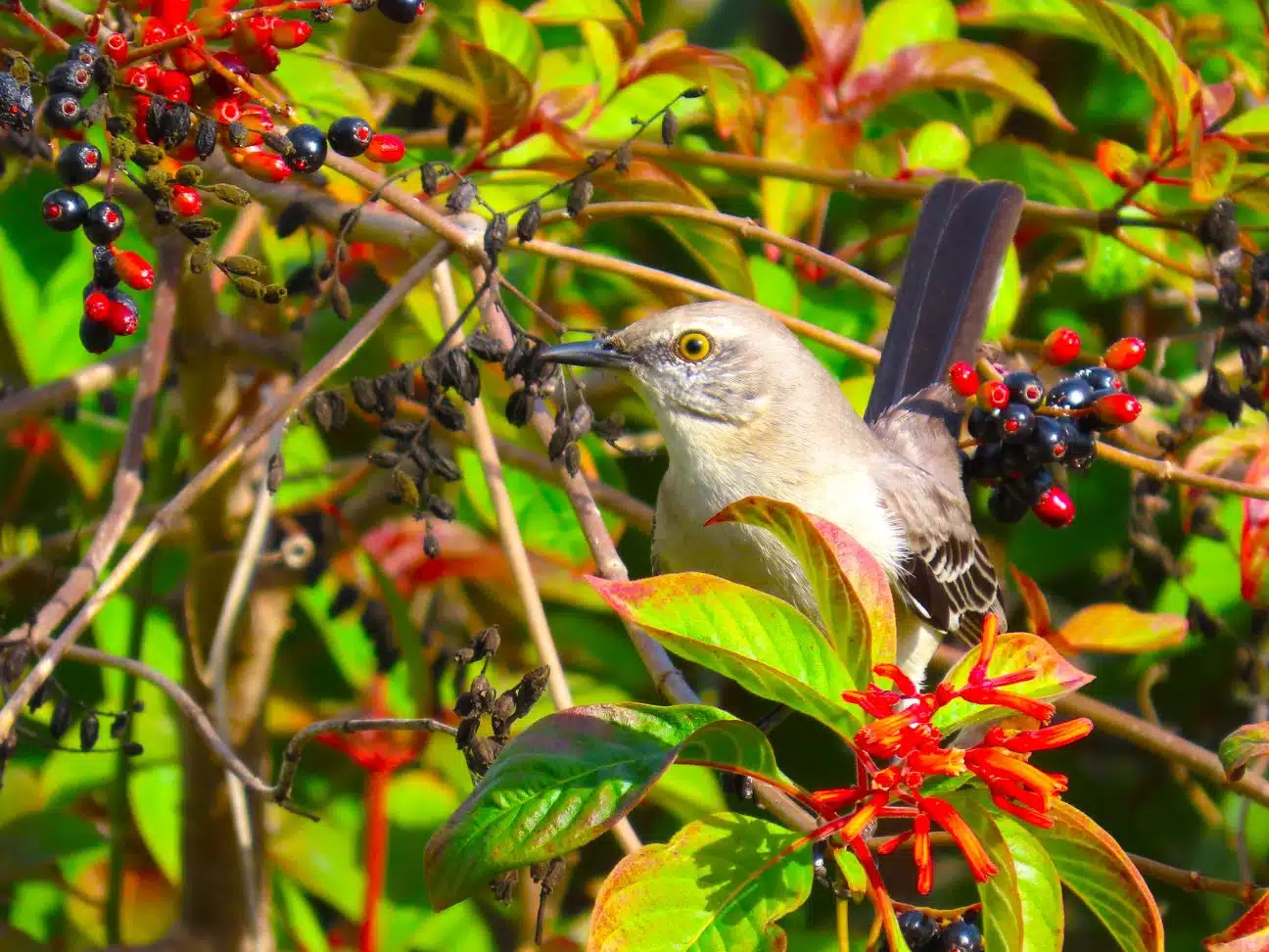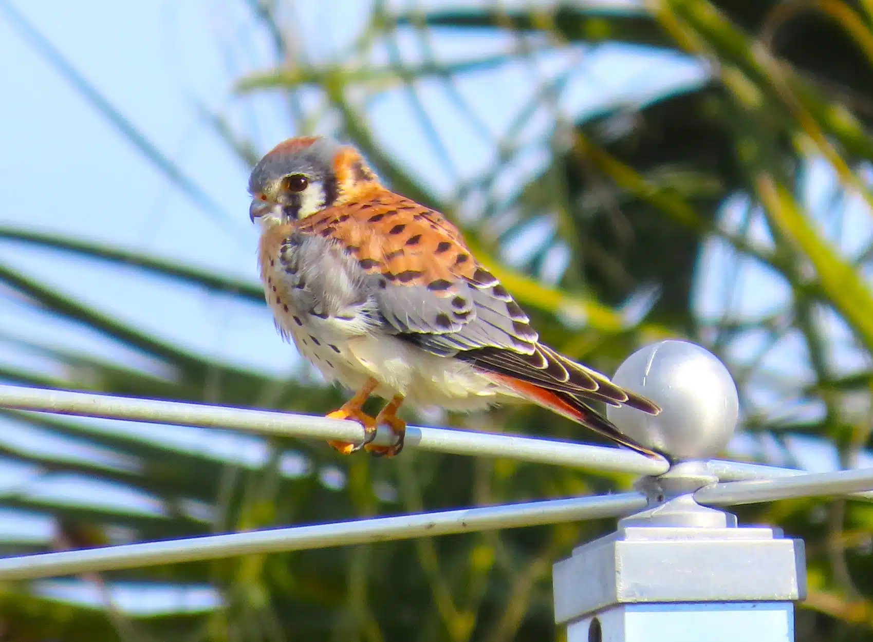 My winter resident birds are always much in evidence at one of my three dripping water baths or on fruit bearing shrubs. This mockingbird was feeding on the numerous berries of firebush. A yellow throated warbler comes daily to the dripping water bath to drink and bathe. I especially enjoy seeing these not only because they are beautiful, but they remind me of my NC summer home where this species breeds in tall pine trees around my home. This adult brown pelican in early breeding plumage is quite striking as it floats on Lemon Bay near my dock. A male kestrel perched on a pole at Wildflower Preserve is also a feathered beauty. An osprey has caught a fish at Wildflower and we were concerned that it might be a treasured tarpon, but it turned out to be a common striped mullet based on the placement of the fins. Finally I have one or more bald eagles that sit most days in a casuarina tree near my house- the presence of this non-native tree is a boon for such raptorial birds since there are no native trees of this height left.