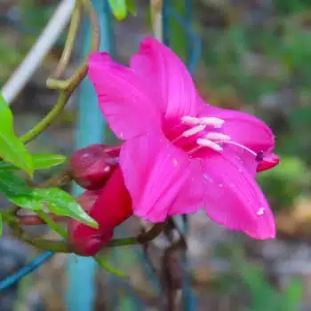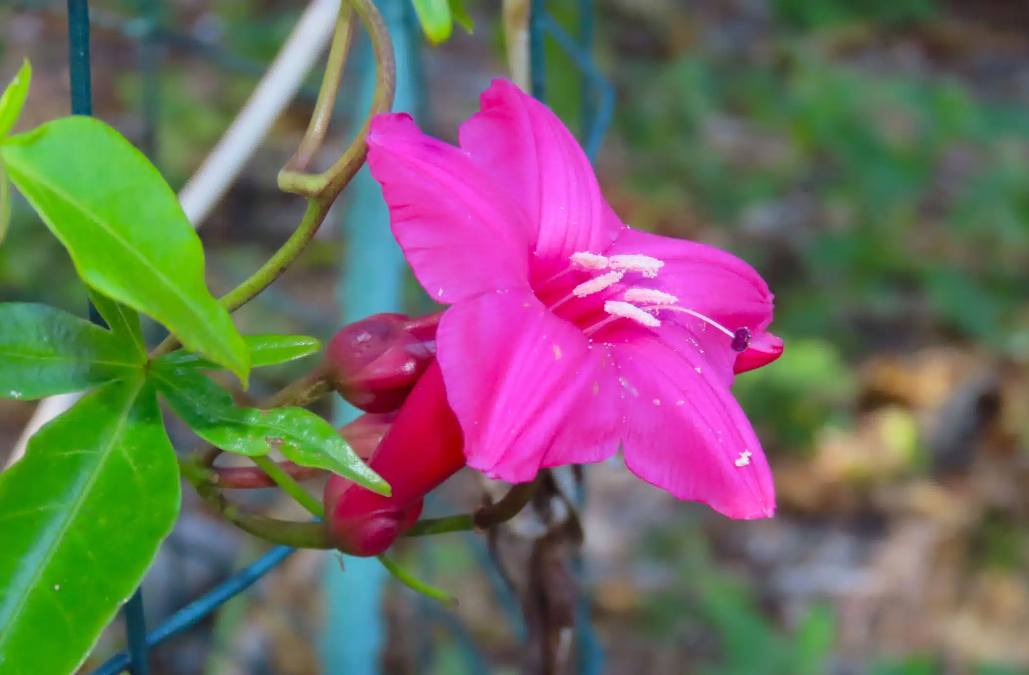 This beautiful red morning glory, cypress or hummingbird vine is native to northern S America but widespread in the tropics ( https://en.wikipedia.org/wiki/Ipomoea_quamoclit ). It has the classic hummingbird flower shape and color with five stamens and one pistil extending out in front so the pollinator will come into contact with it. I am trying to grow it in my yard since my many coral honeysuckles have been less than successful lately. We only have hummingbirds passing through in migration in Spring and Fall.
